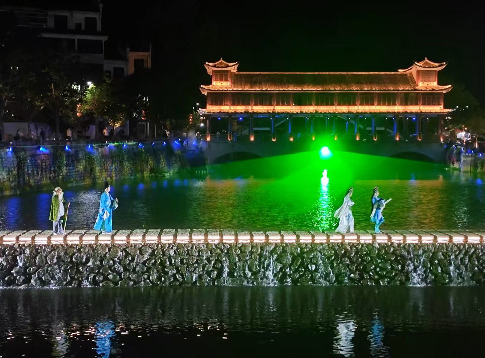 517日晚,田野二组来到镇上观看灯光秀。夜幕降临,九资河镇灯光秀璀璨开场。古桥飞檐翘角,被暖黄灯光勾勒,尽显端庄灵动,与水面交相辉映,诉说小镇悠悠历史。绿色光束穿透夜幕,在水面跳跃闪烁,与古桥暖光映衬,营造出神秘迷人氛围。光束摇曳于水波,融合水之灵动与光之绚丽,将人带入奇幻世界。身着古装的表演者是亮点。他们衣袂飘飘、身姿矫健,在石板步道徐行,似从古代穿越而来。每一步、每一手势,都在演绎小镇往昔,或是文人风雅,或是百姓喜乐。这场灯光秀,不只是视觉盛宴,更是九资河镇深厚文化的呈现。它以光为笔、影为墨,在夜色中绘就小镇独特魅力。观者沉醉其中,仿若穿越时空,领略到古镇独有的古韵与风情,留下难以磨灭的美好记忆。