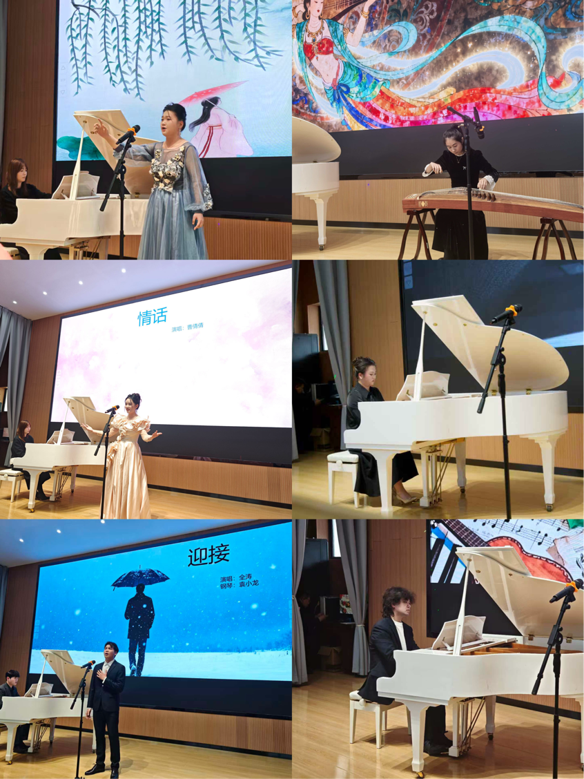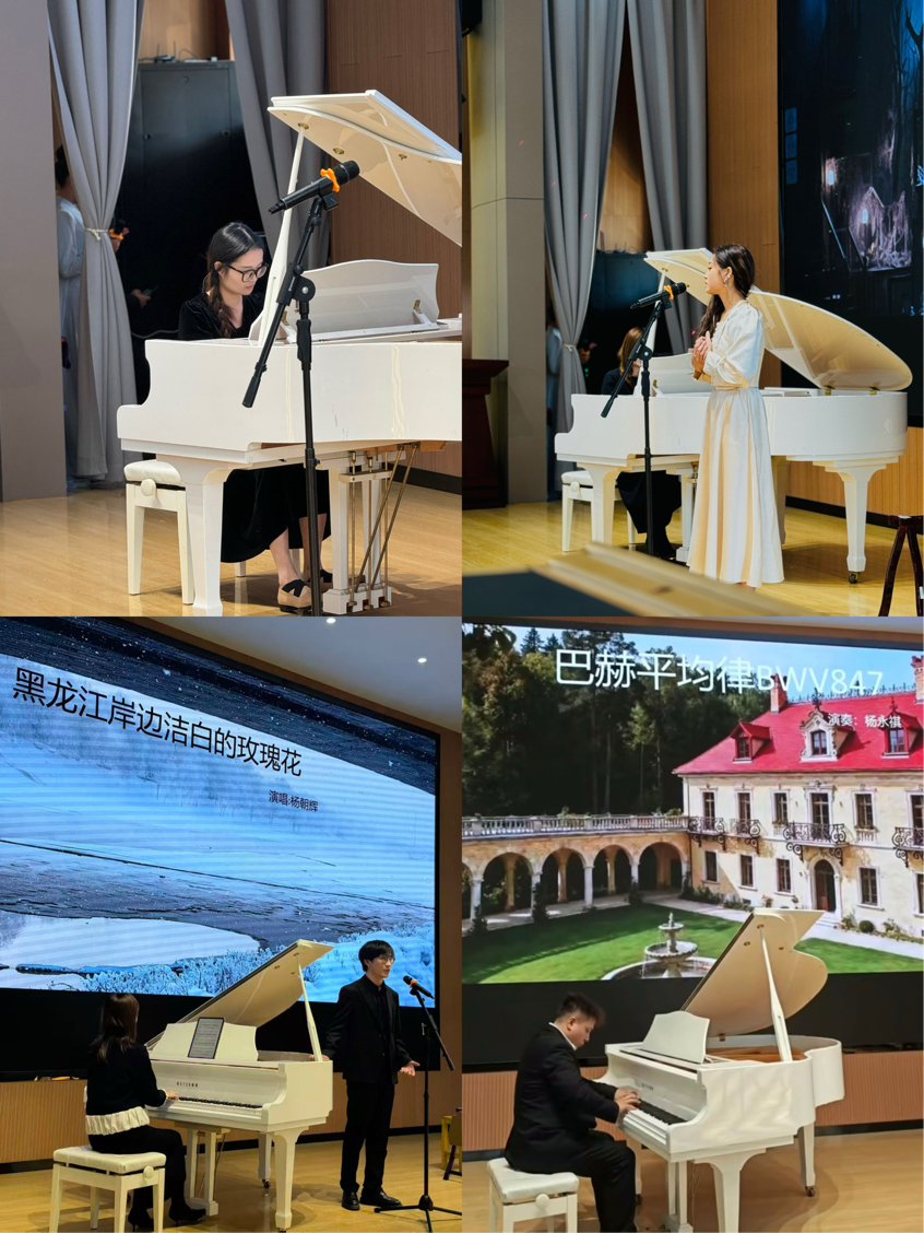 下半场演出同样精彩迭出:张雨涵的《越调小桃红·采莲女》融合古典诗词韵味与现代音乐灵动,孙雪的古筝独奏《敦煌唐人舞》复刻敦煌文化的神秘悠远,张梓涵的《740八度练习曲》以2分钟的精湛演绎展现钢琴技巧的爆发力;曹倩倩的《情话》、王紫蕴的贝多芬《第三钢琴奏鸣曲第一乐章》、全涛与袁小龙合作的韩国艺术歌曲《迎接》各具特色,最后,张韫睿的钢琴独奏《波多黎各的回忆》以明快节奏勾勒热带风情,为音乐会画上圆满句号。