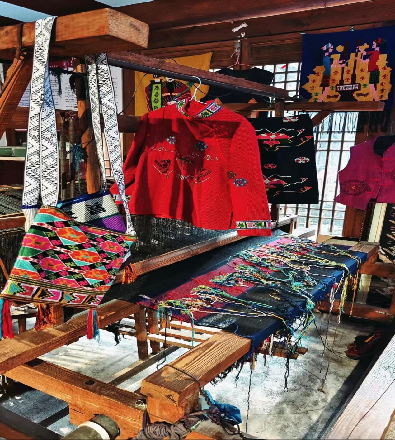 民俗体验区内,传统织布机上色彩斑斓的西兰卡普绚丽夺目,这些国家级非物质文化遗产,尽显土家织女的巧思。不远处,身着民族服饰的模特展示着土家传统服装的独特魅力,让人领略到土家族的风情万种。